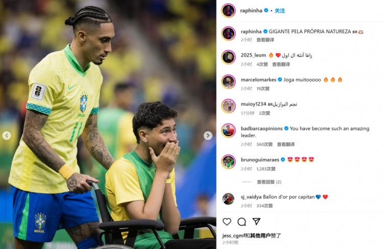 拉菲尼亞也通過社媒曬出自己賽前為殘障球迷手推輪椅的照片,并配文:“他們在心靈層面是巨人。”