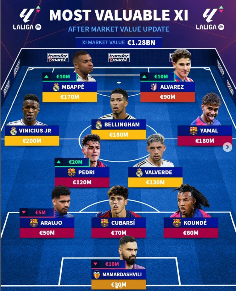 德轉(zhuǎn)列西甲身價(jià)最貴陣::總身價(jià)12.8億歐元