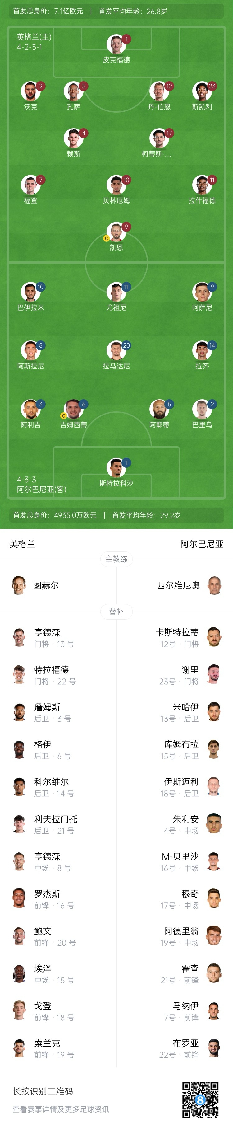 英格蘭首發:1-皮克福德、2-沃克、5-孔薩、12-丹-伯恩、23-斯凱利、4-賴斯、17-柯蒂斯-瓊斯、7-福登、10-貝林厄姆、11-拉什福德、9-凱恩