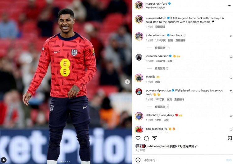 本場比賽拉什福德首發(fā)上陣,賽后他也在個人社媒曬出笑容滿面的訓(xùn)練照,配文寫道:“重回球隊并與這些隊友重聚感覺太棒了,為世預(yù)賽奠定堅實的基礎(chǔ),后面還有更多挑戰(zhàn)!”