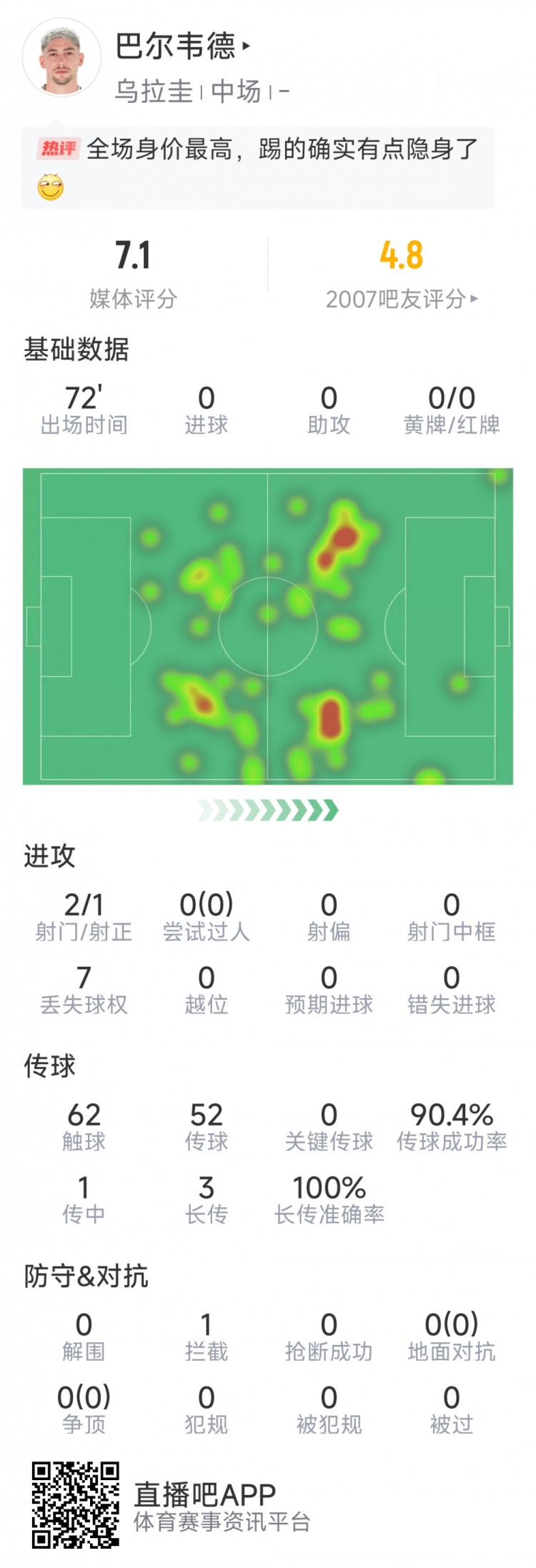 存在感不強(qiáng),巴爾韋德本場數(shù)據(jù):2射1正,對(duì)抗&搶斷等數(shù)據(jù)掛零?