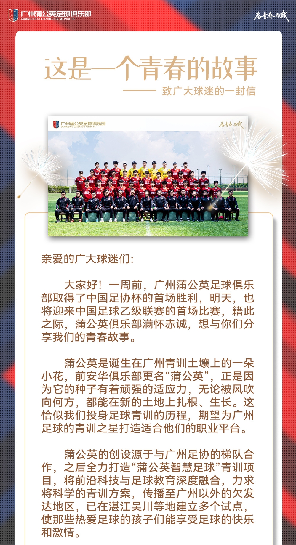 大家好!一周前,廣州蒲公英足球俱樂部取得了中國足協杯的首場勝利。明天,也將迎來中國足球乙級聯賽的首場比賽,籍此之際,蒲公英俱樂部滿懷赤誠,想與你們分享我們的青春故事。