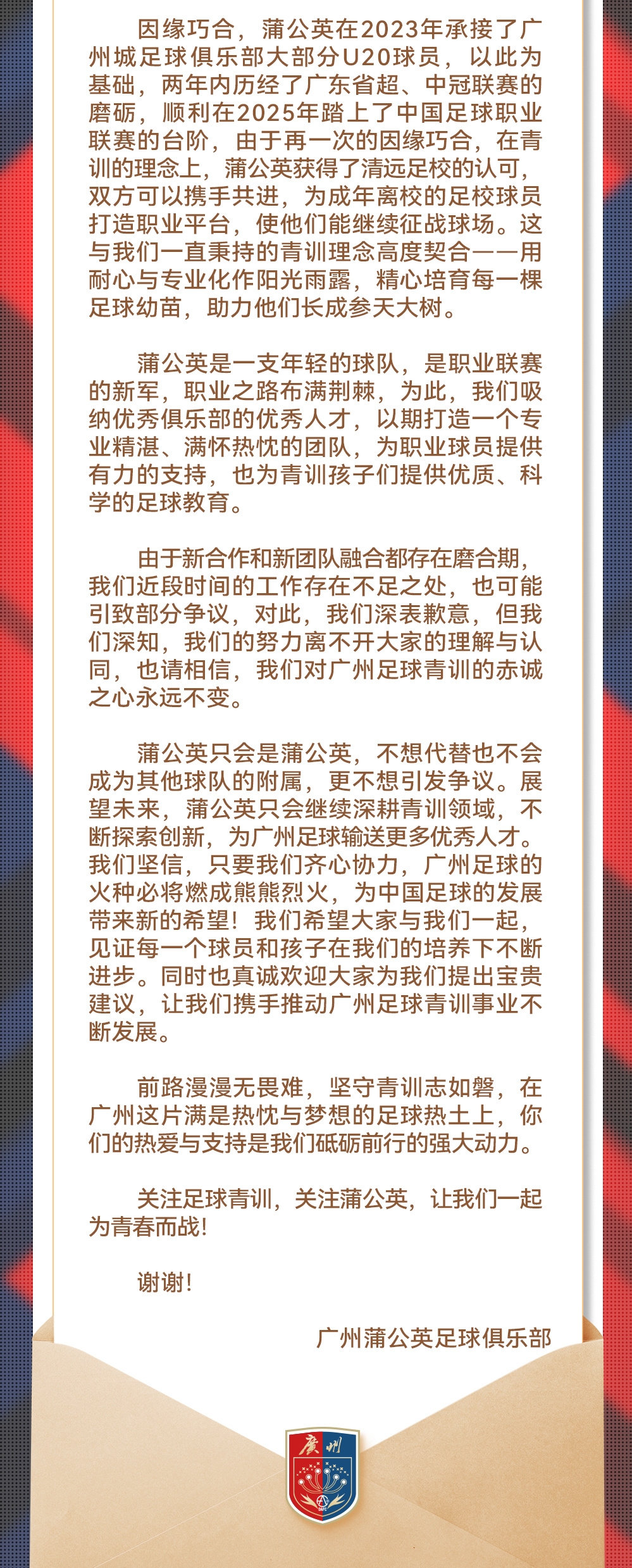 蒲公英只會是蒲公英,不想代替也不會成為其他球隊的附屬,更不想引發爭議。展望未來,蒲公英只會繼續深耕青訓領域,不斷探索創新,為廣州足球輸送更多優秀人才。我們堅信,只要我們齊心協力,廣州足球的火種必將燃成熊熊烈火,為中國足球的發展帶來新的希望!我們希望大家與我們一起,見證每一個球員和孩子在我們的培養下不斷進步,同時也真誠歡迎大家為我們提出寶貴建議,讓我們攜手推動廣州足球青訓事業不斷發展。