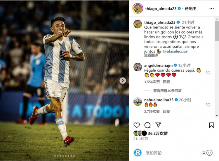 阿爾馬達社媒曬出自己慶祝進球的照片,配文:“身穿最美麗的球衣再次進球的感覺是多么美妙,感謝所有來支持我們的阿根廷球迷,永遠團結一致。”