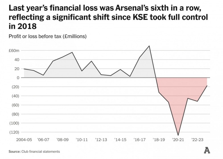 在2018年之后,阿森納連續(xù)六年出現(xiàn)財務虧損,也體現(xiàn)了阿森納財務所有權重大轉變后的影響