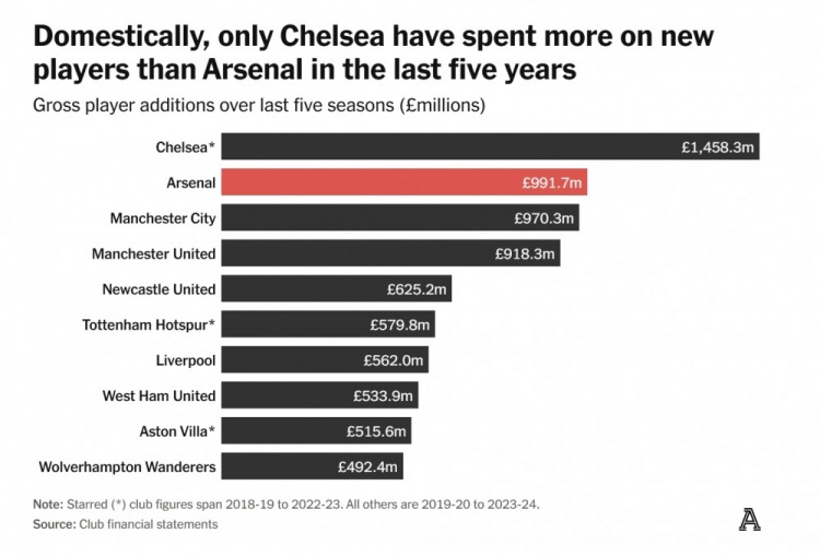 過去五年,只有切爾西在轉會市場上的投入超過阿森納