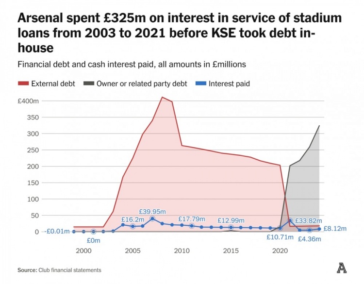 2003年到2021年,KSE內(nèi)部承擔債務之前,阿森納在球場貸款利息上花費了3.25億英鎊
