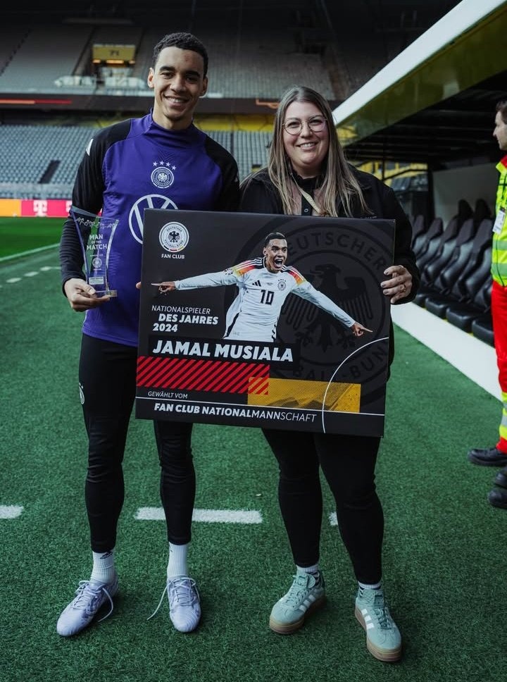 3月23日訊 穆西亞拉當選了球迷票選的2024年德國國家隊年度最佳球員。昨天,穆西亞拉領取了獎杯。