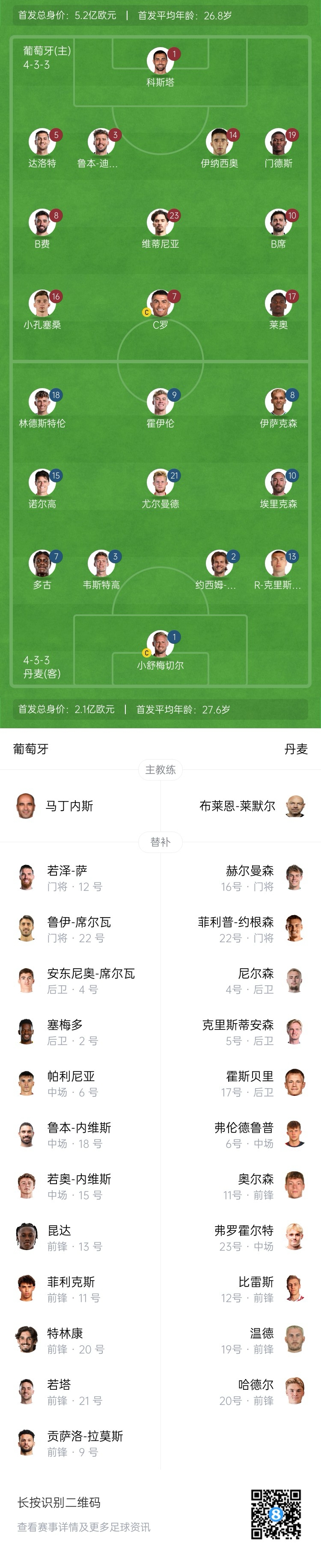 3月24日訊 歐國聯1/4賽決賽次回合,葡萄牙對陣丹麥,賽前首發公布。