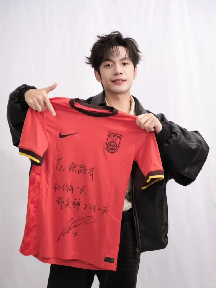 3月24日訊 在個人社媒,歌手張顏齊曬出武磊to簽的國足球衣。