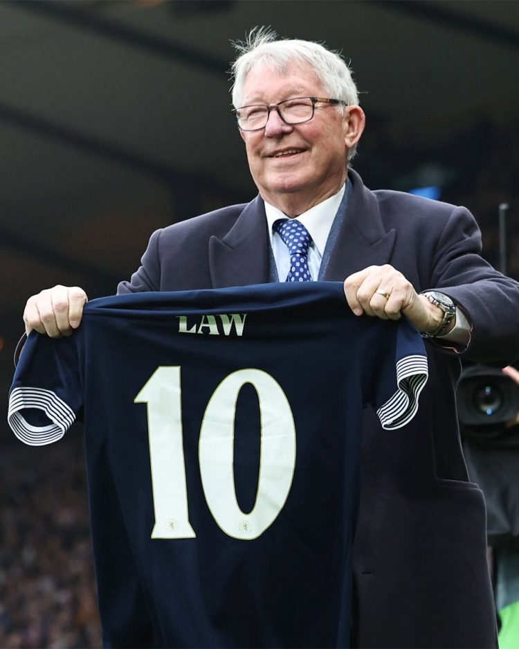 3月24日訊 當(dāng)?shù)貢r間上周末蘇格蘭對陣希臘的歐國聯(lián)賽前,弗格森手持丹尼斯-勞蘇格蘭隊10號球衣,向其致以敬意。