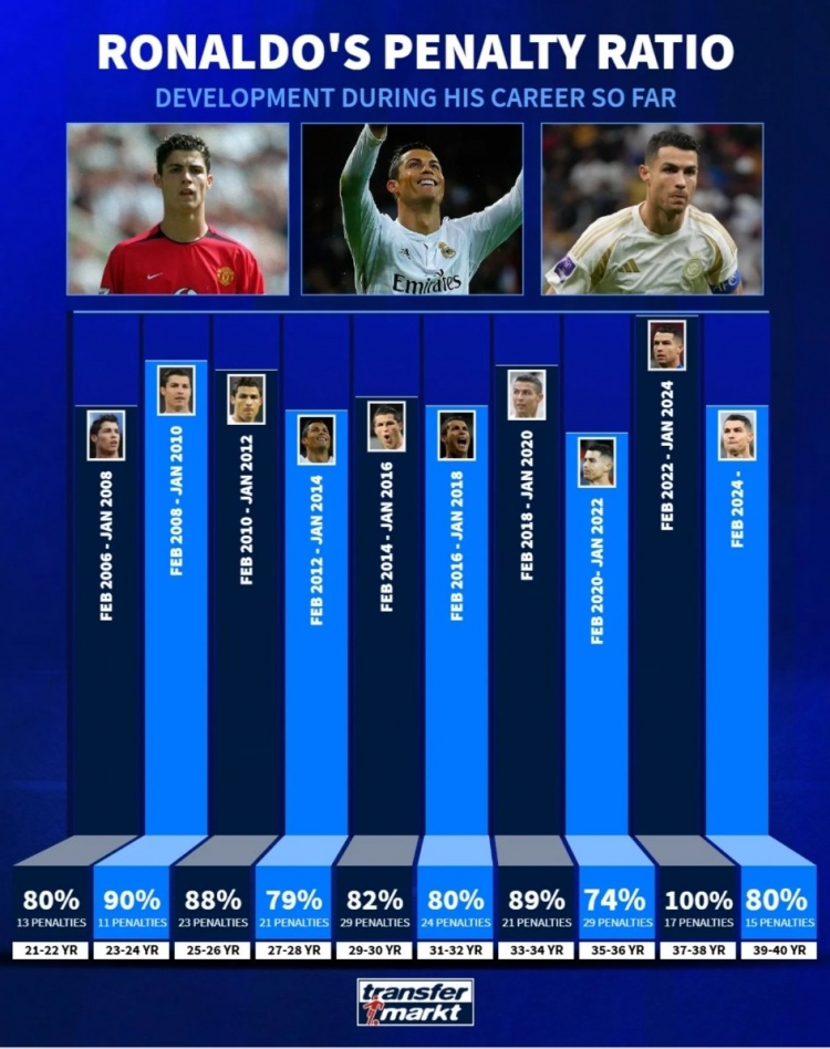C羅職業生涯點球命中率:37到38歲100%最高,39到40歲80%?