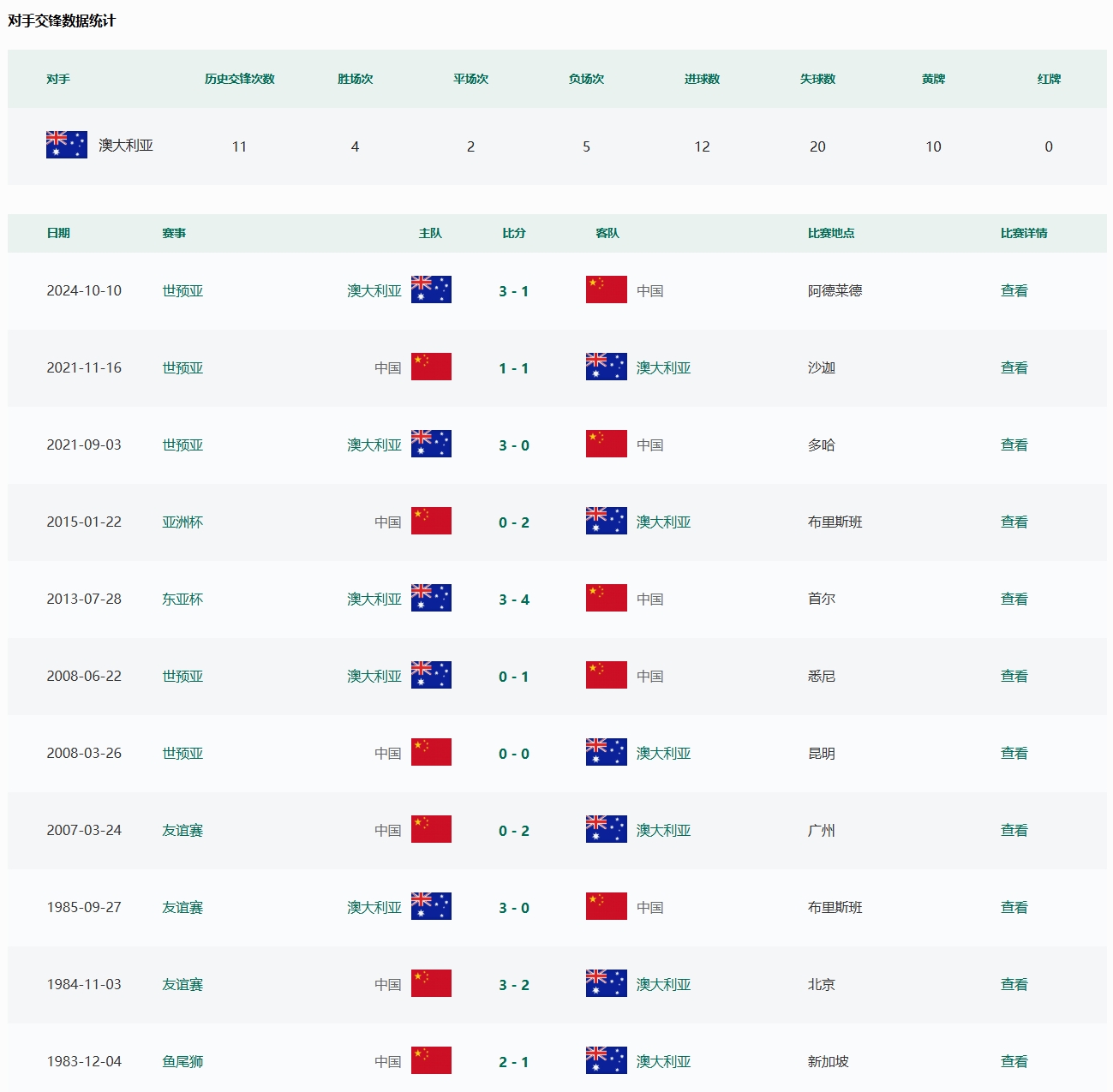 根據中國足協官網數據顯示,國足此前共11次交手澳大利亞,取得4勝2平5負的戰績。