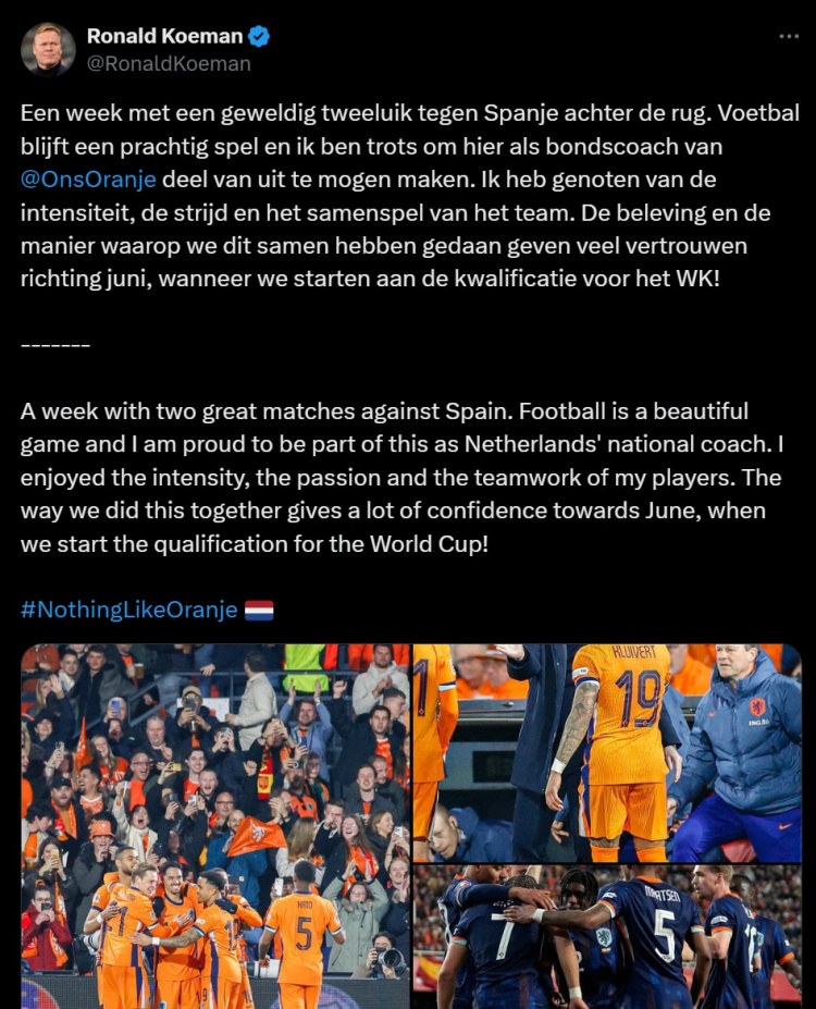 3月25日訊 荷蘭在歐國聯八強戰經歷點球大戰不敵西班牙,主帥科曼在今日通過社媒發文。