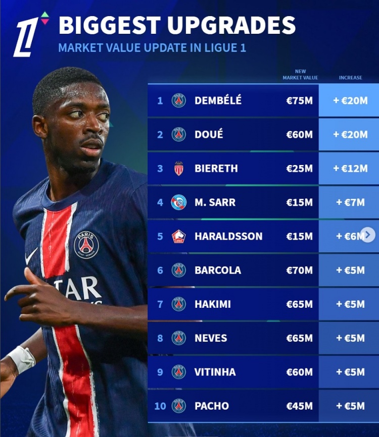 3月25日訊 《轉(zhuǎn)會(huì)市場(chǎng)》已經(jīng)更新了法甲球員身價(jià),并列出了升值最多榜單,巴黎7將在列。