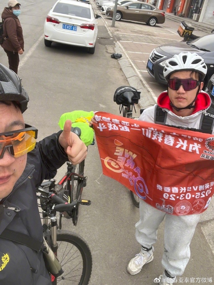 3月25日訊 根據亞泰俱樂部官方的消息,兩名亞泰球迷用長春騎行到大連的方式,前往大連客場為亞泰助威。