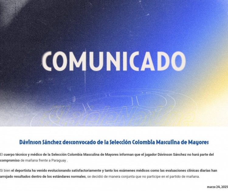 哥倫比亞隊發布官方公告,確認達文森-桑切斯的健康狀況正在好轉,體檢結果也在正常范圍內,但經球隊與球員一致決定,他將不會參加對陣巴拉圭的世預賽。