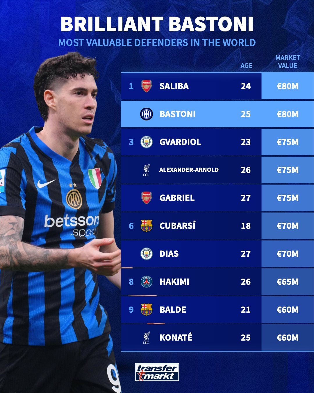 德轉(zhuǎn)最新后衛(wèi)身價top10:巴斯托尼8000萬歐,與薩利巴并列第1?