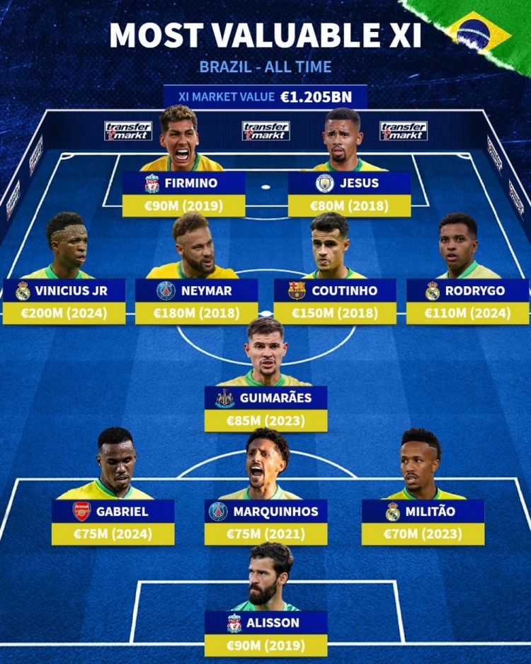 3月26日訊 北京時間今天上午8點,巴西將在世預賽中客場對陣阿根廷。德國轉(zhuǎn)會市場列出了巴西歷史德轉(zhuǎn)身價最高陣容,內(nèi)馬爾、維尼修斯、庫蒂尼奧在列,總價12.05億歐。