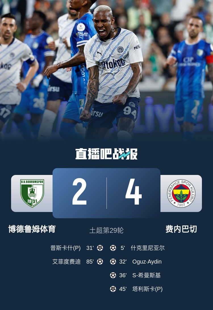 13輪不敗!費內(nèi)巴切4-2博德魯姆體育距榜首6分 塔利斯卡點射+送點