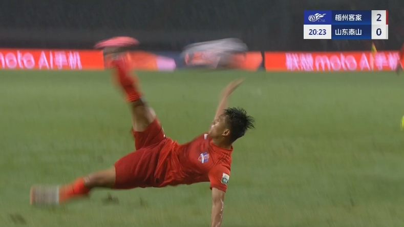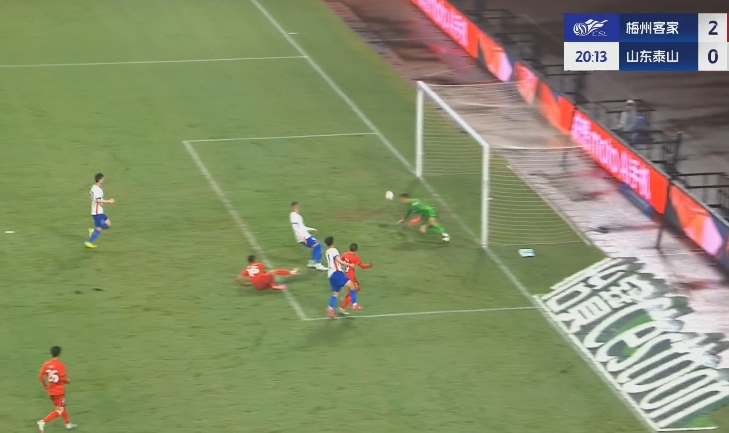 第20分鐘,梅州客家再入一球,約契奇送出助攻,楊超聲禁區內高難度倒鉤破門,梅州客家2-0領先山東泰山。