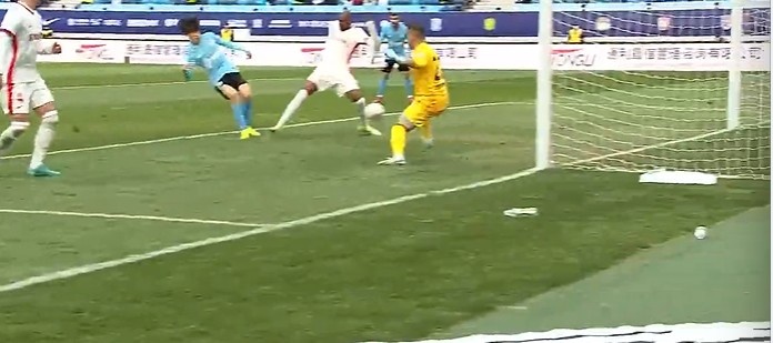 第31分鐘,大連英博首開記錄!馬萊萊右路禁區橫傳門前朱鵬宇推射破門,大連英博1-0長春亞泰。↓