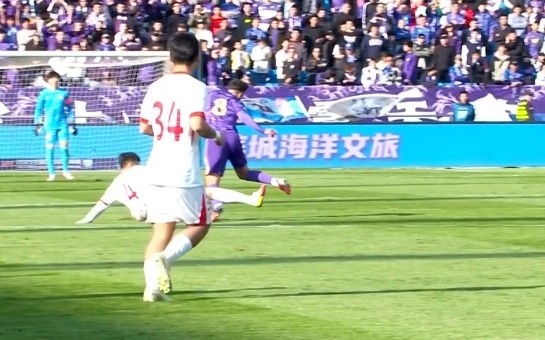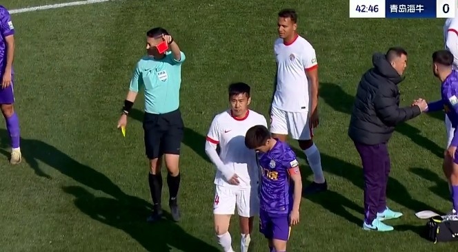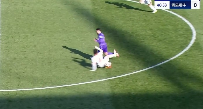 第40分鐘,金洋洋中場攔截飛鏟踢倒進攻球員,主裁判第一時間出示黃牌。↓