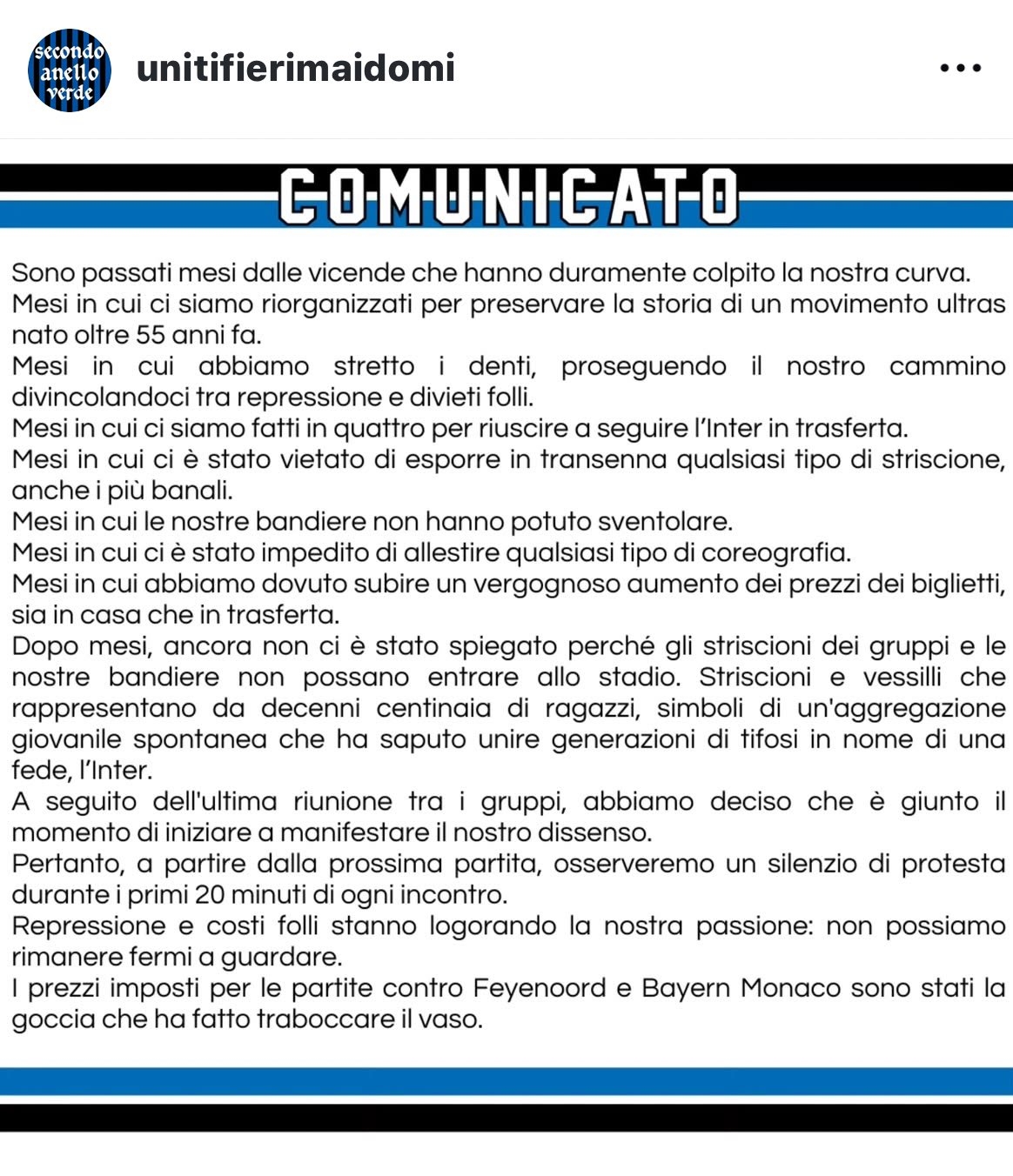 3月30日訊 國米北看臺球迷組織發布公告,宣布在之后每場比賽的前20分鐘保持沉默,抗議票價過高、主場禁止攜帶標語等情況。