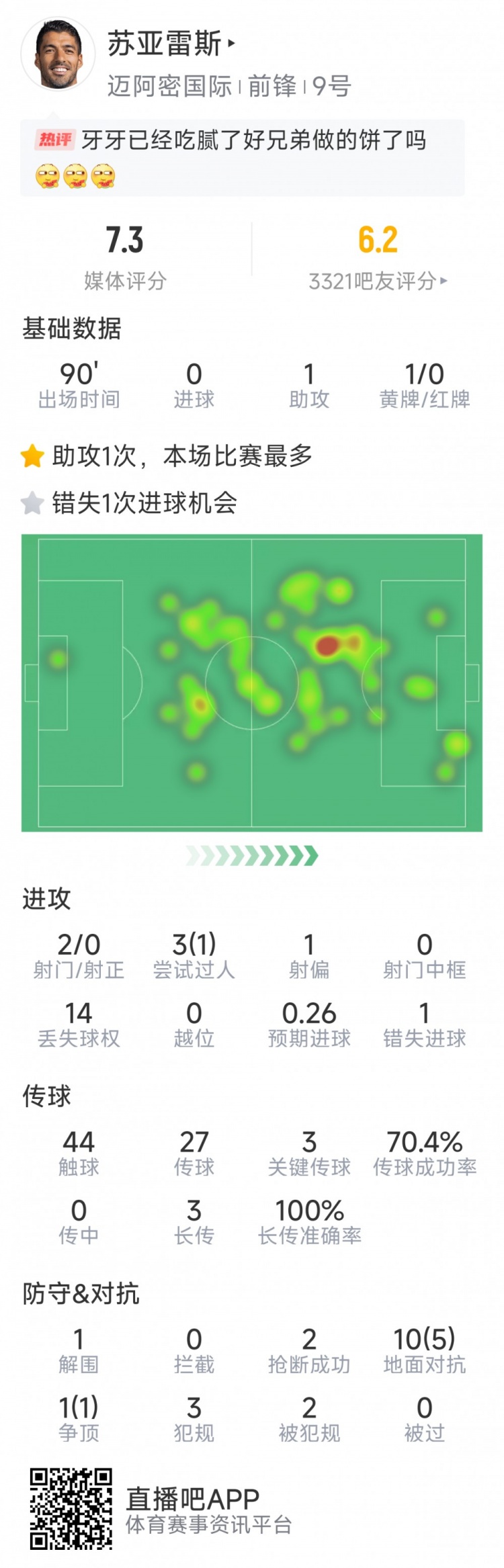 助攻梅西!蘇亞雷斯當選本場比賽邁阿密隊內最佳球員