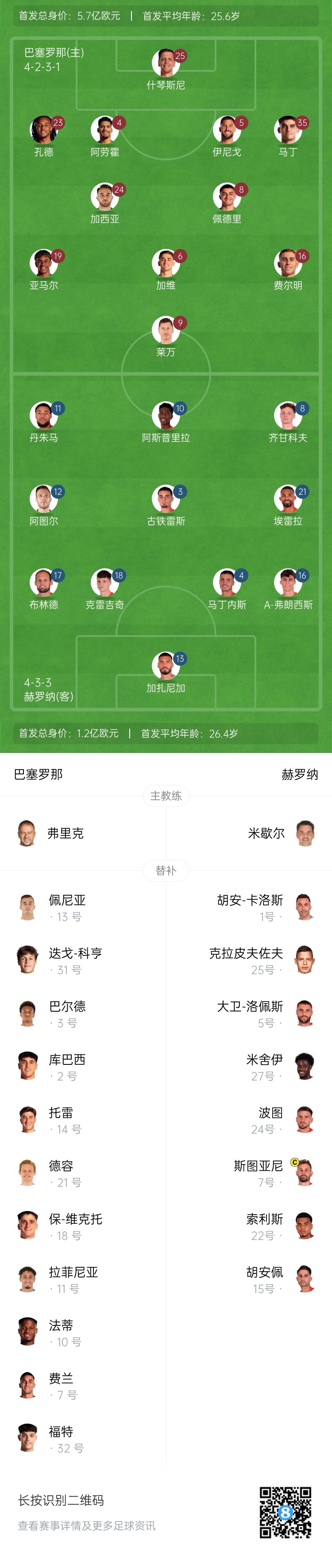 巴薩首發:25-什琴斯尼、4-阿勞霍、5-伊尼戈-馬丁內斯、23-孔德、24-埃里克-加西亞、35-杰拉德-馬丁、6-加維、8-佩德里、16-費爾明、19-亞馬爾、9-萊萬
