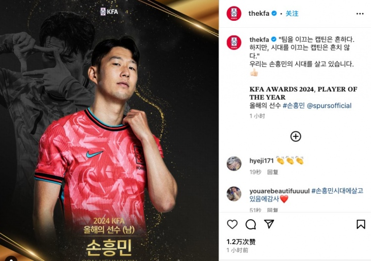 官方:孫興慜當選韓足協(xié)2024年度最佳球員,第8次獲得該獎項
