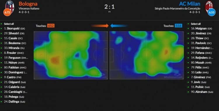 輸給博洛尼亞,米蘭的熱區表現:中場根本沒有任何的控制力