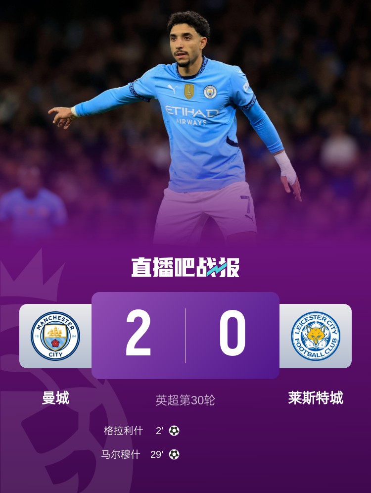格拉利什閃擊破門(mén),馬爾穆什擴(kuò)大領(lǐng)先優(yōu)勢(shì),曼城2-0擊敗萊斯特城。
