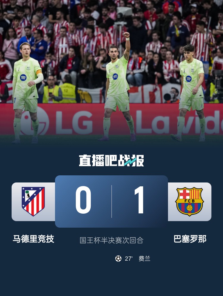 費(fèi)蘭制勝,巴薩客場(chǎng)1-0戰(zhàn)勝馬競(jìng),總比分5-4淘汰馬競(jìng)進(jìn)軍國(guó)王杯決賽,將對(duì)陣皇馬。