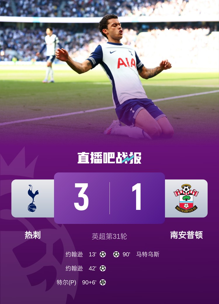 熱刺本輪3-1擊敗南安普頓,圣徒在聯賽剩余7輪的情況下提前降級,也創下了聯賽紀錄。