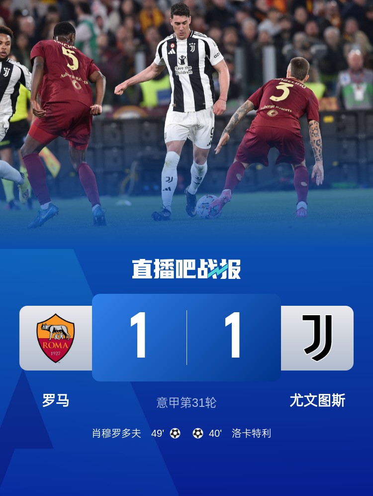 尤文1-1戰平羅馬,羅馬的聯賽7連勝遭終結,不過紅狼軍團的聯賽不敗場次也來到15場。