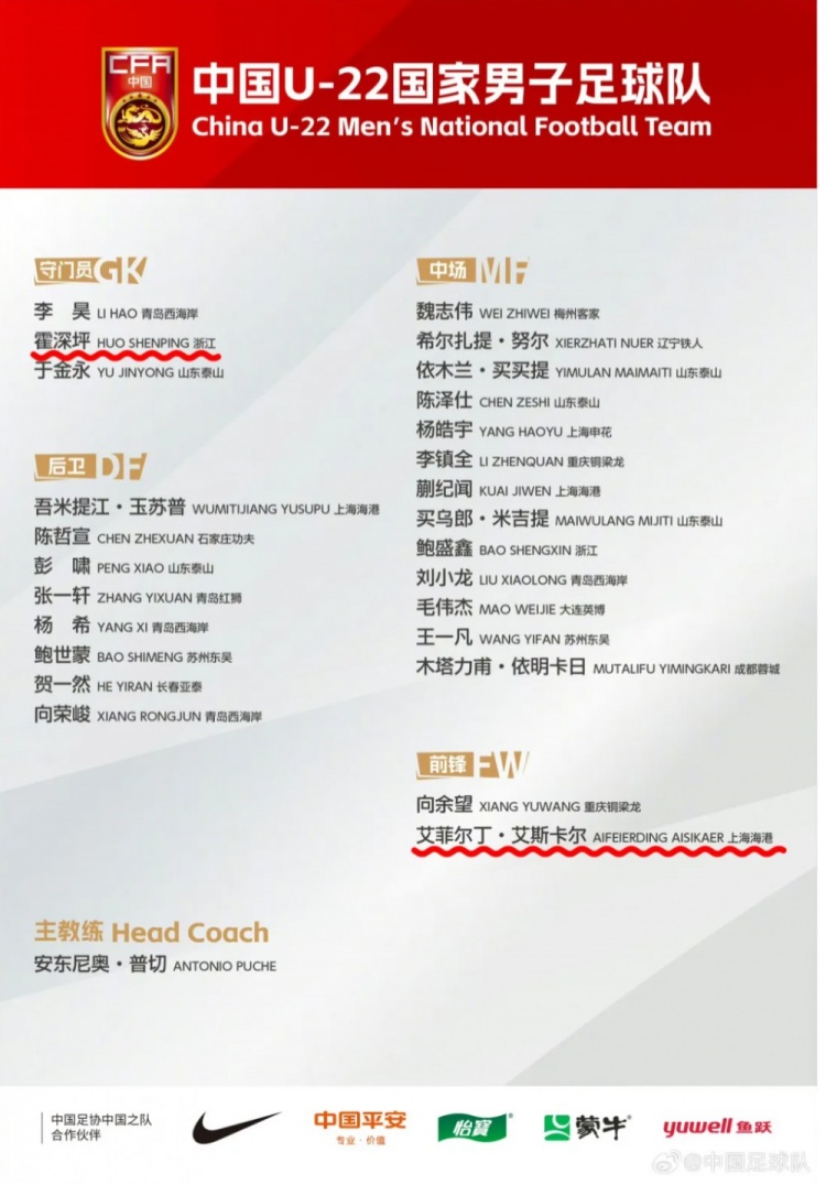 3月4日訊 恒大足球學校發文,祝賀霍深坪、艾菲爾丁入選U22國足集訓名單。