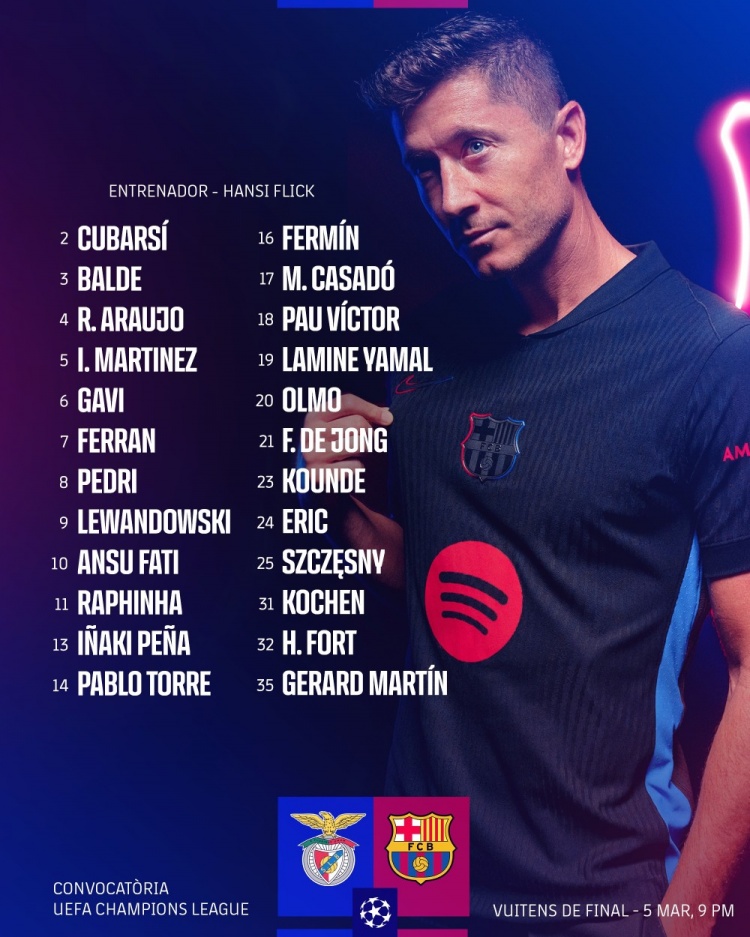 巴薩歐冠客戰本菲卡名單:萊萬、亞馬爾、加維、奧爾莫在列?