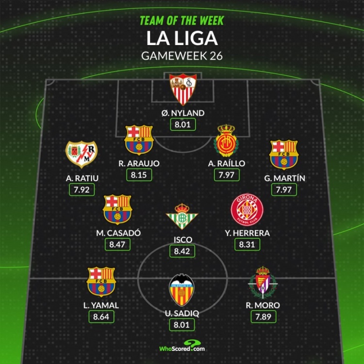 WhoScored評西甲第二十六周最佳陣:巴薩四名球員入選?