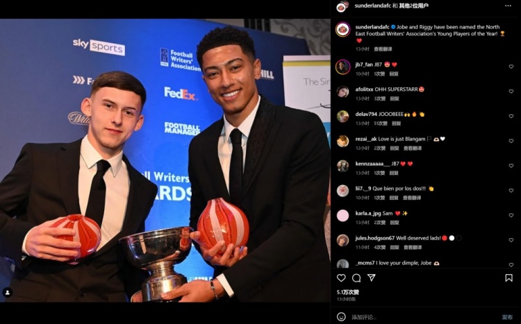 3月4日訊 官方消息,桑德蘭中場喬貝-貝林厄姆以及克里斯-里格獲英格蘭東北地區足球作家協會評選的年度最佳年輕球員獎。