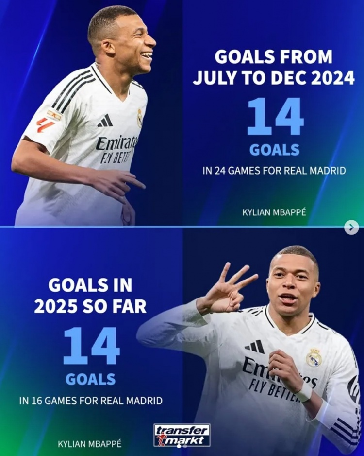 作為對比,姆巴佩在去年7月到12月共計24場打進14球,而進入2025年后16場也打進14球。