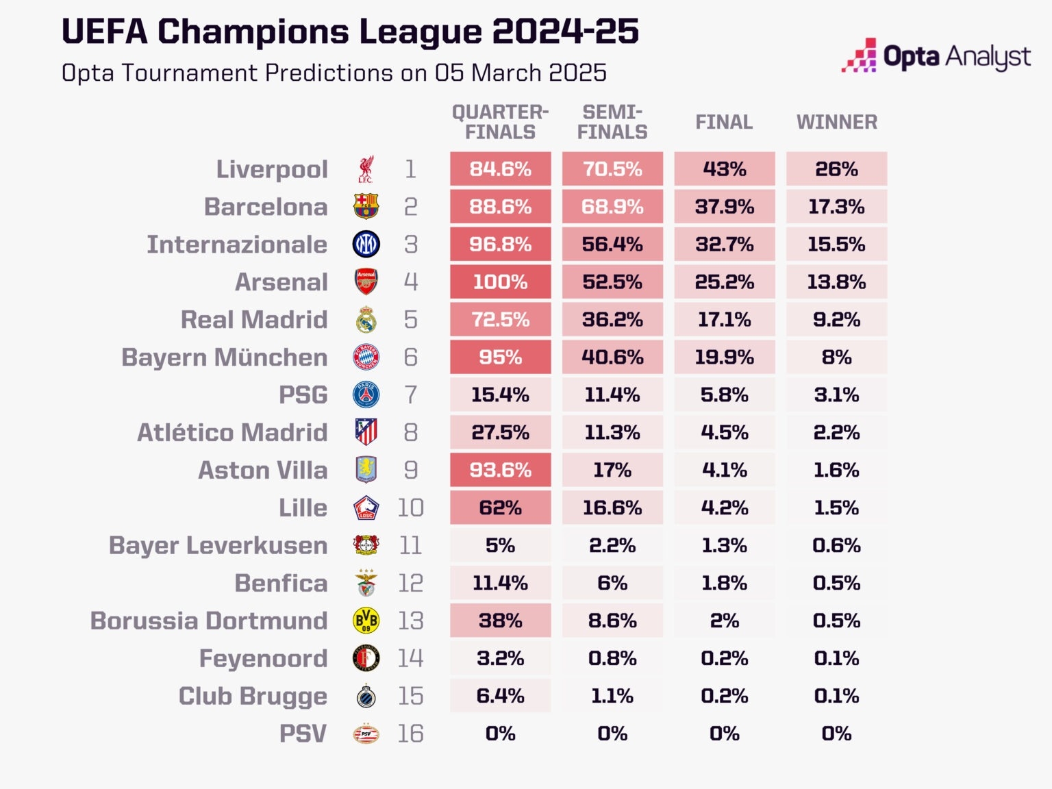 Opta歐冠晉級概率:利物浦、巴薩有望會師決賽 國米、槍手劍指4強?