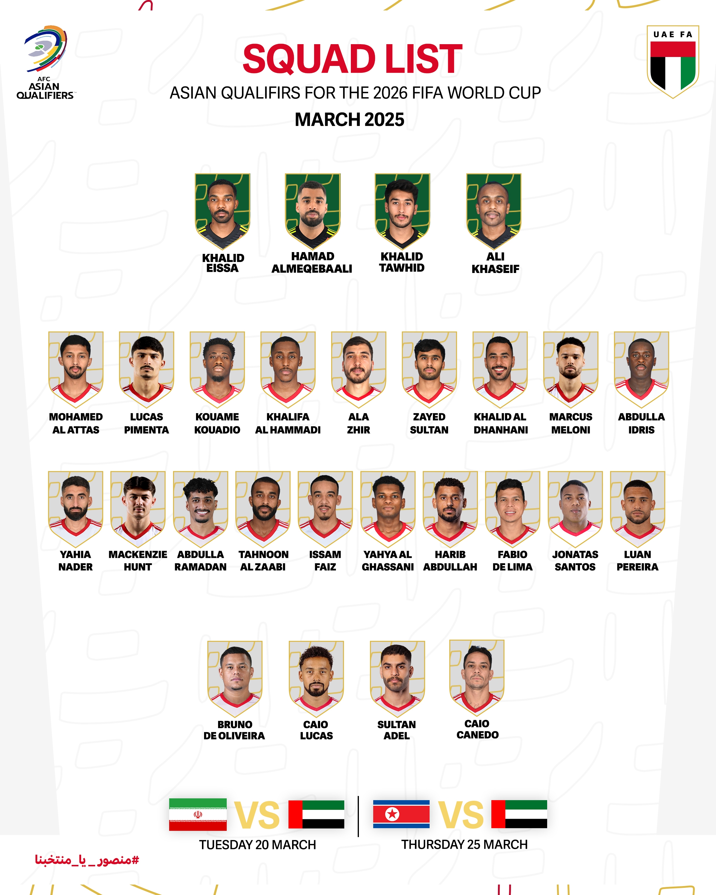據巴西媒體環球體育報道,本期阿聯酋名單中征召了8名在巴西出生的歸化球員。8名球員為:盧卡斯-皮門塔、馬科斯-梅洛尼、法比奧-德利馬、喬娜塔斯-桑托斯、盧安-佩雷拉、布魯諾-奧利維拉、盧卡斯和卡內多。其中喬娜塔斯-桑托斯和盧卡斯是首次被阿聯酋征召。