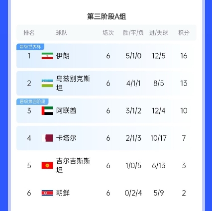 目前在世預賽亞洲區A組積分榜上,阿聯酋6輪3勝1平2負排在第三,距離第二的烏茲別克斯坦差3分。