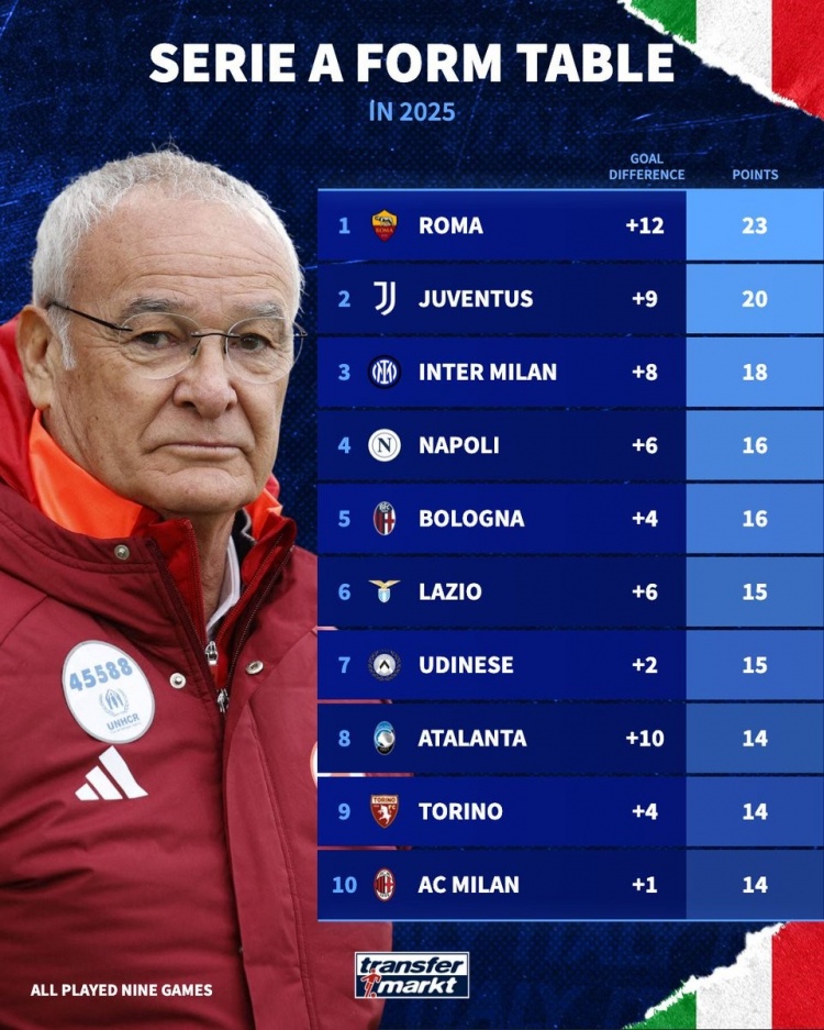 只手補天!2025意甲積分榜:羅馬23分居首,尤文20分、國米18分?