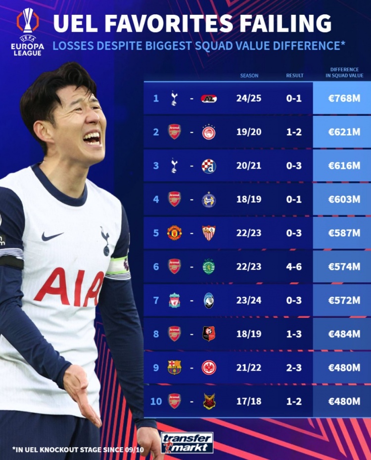 3月7日訊 熱刺在本輪歐聯杯16強戰首回合0-1不敵阿爾克馬爾,延續了近期低迷狀態。《轉會市場》也列出了近年五大聯賽豪門球隊在歐聯杯淘汰賽被爆冷情況。