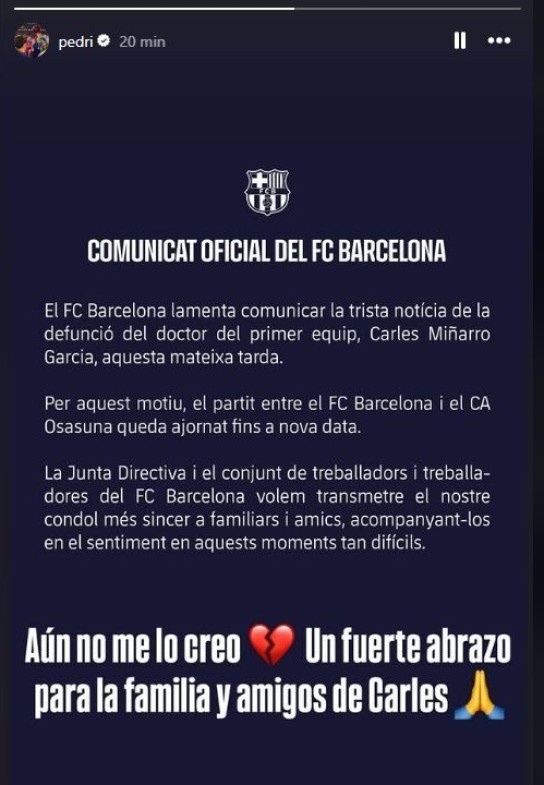 在消息出來后,許多巴薩球員都在社交媒體上悼念了卡萊斯,佩德里轉發了訃告并寫道:“我仍然不敢相信這是真的,給卡萊斯的家人和更有一個大大的擁抱。”