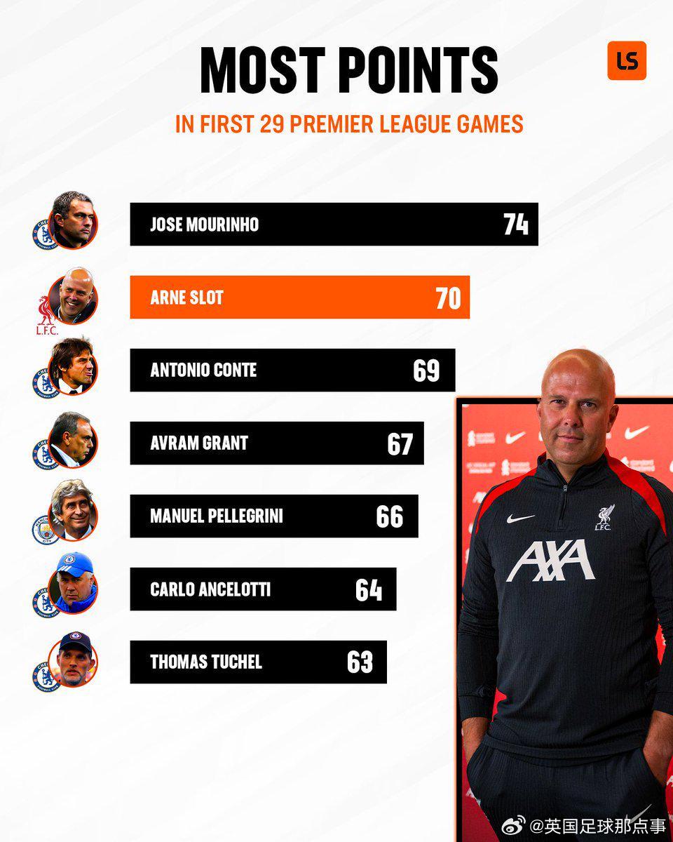 英超主帥前29場積分:穆帥74分第1,斯洛特70分第2,藍軍主帥霸榜?