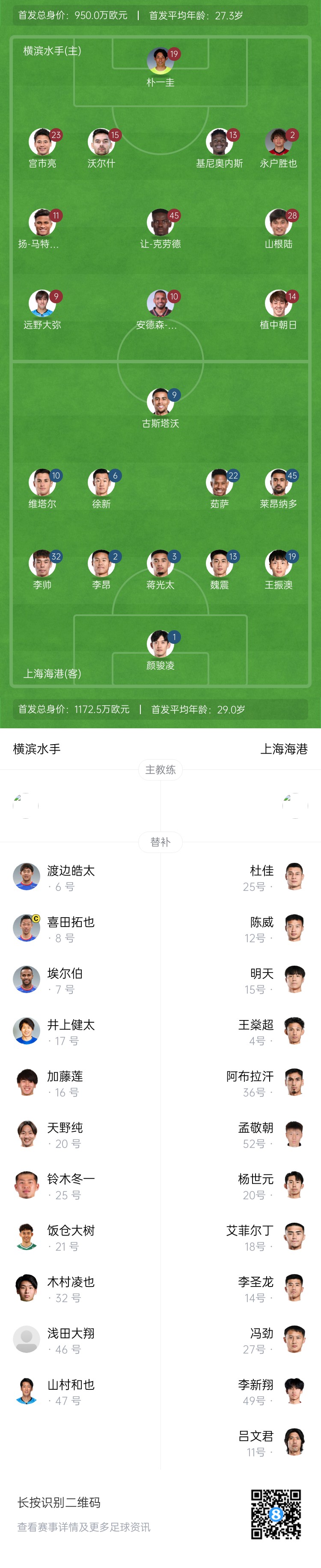03月11日訊 北京時間18點,亞冠精英聯賽1/8決賽東亞區次回合,上海海港客場挑戰橫濱水手,賽前官方公布兩隊首發陣容。