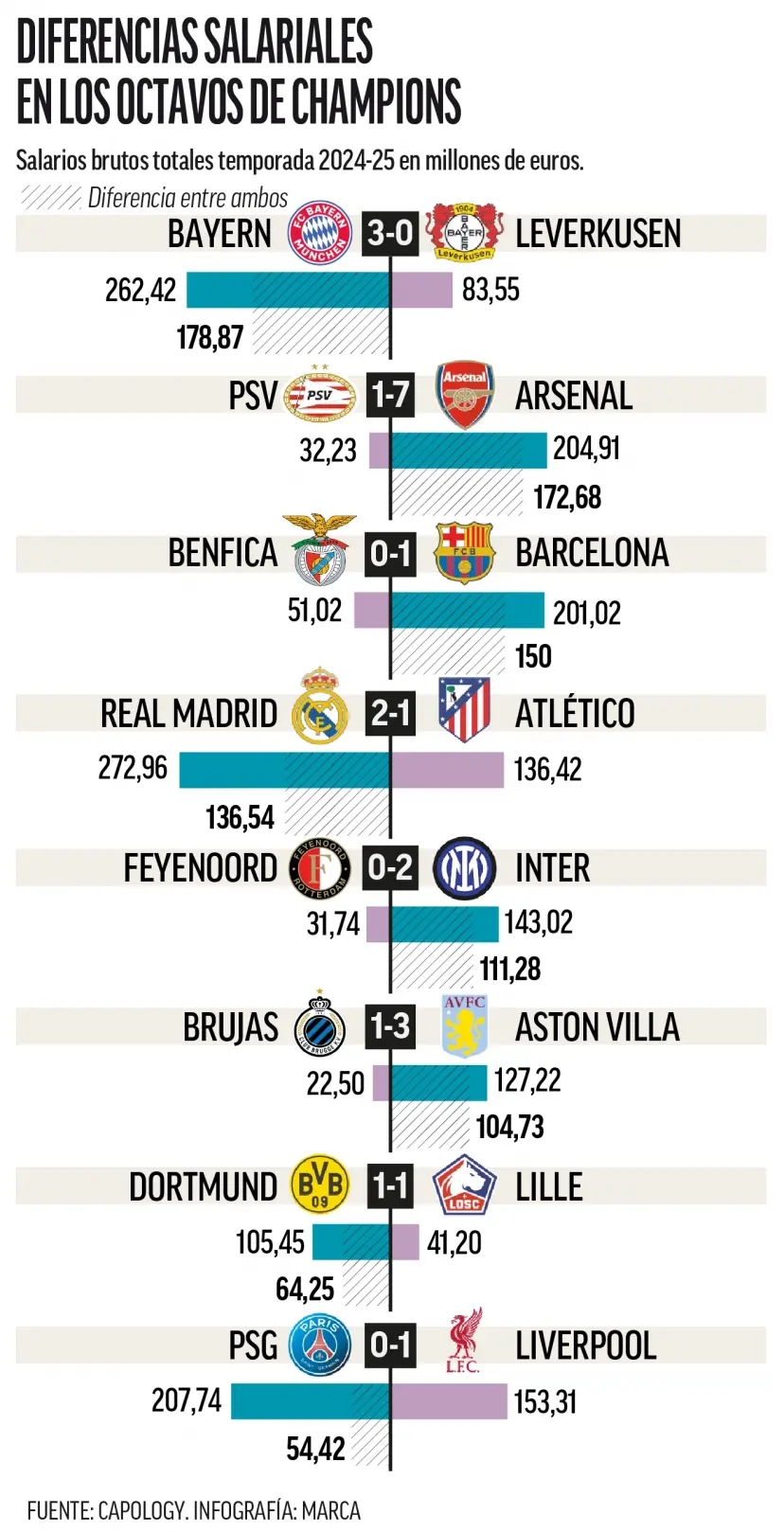根據(jù)足球財務(wù)專業(yè)網(wǎng)站Capology的數(shù)據(jù),如果以球員薪資支出為標(biāo)準(zhǔn),最不平衡的淘汰賽是對陣拜仁和勒沃庫森的比賽,拜仁的薪資支出幾乎是對手的三倍(2.624億歐元對8350萬歐元)。第二大差距出現(xiàn)在阿森納與埃因霍溫的對決中,阿森納球員的2.049億歐元薪資遠(yuǎn)超埃因霍溫的3220萬歐元,差距高達(dá)六倍。第三個薪資差距較大的對決是本菲卡與巴塞羅那,巴薩球員的薪水是葡萄牙球隊的四倍(2.01億歐元對5100萬歐元)。皇馬與馬競的陣容薪資差距恰好是兩倍,皇馬為2.729億歐元,馬競為1.364億歐元。